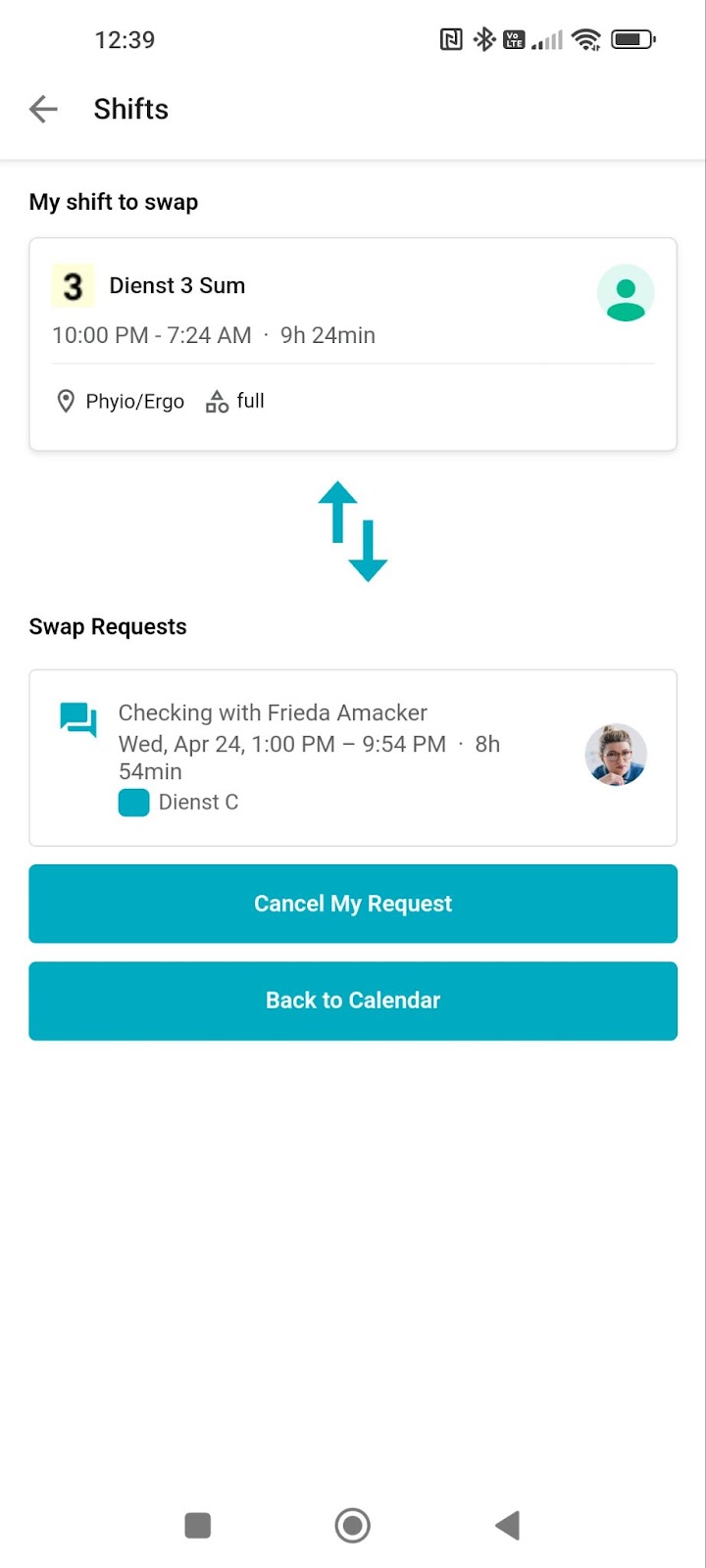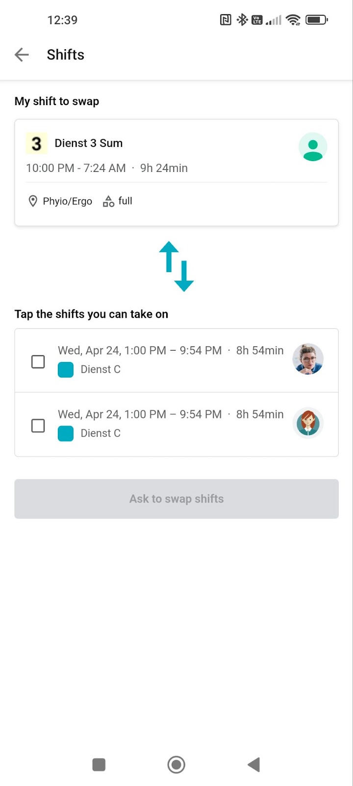 Ja, Du kannst mehrere Schichten an einem bestimmten Tag auswählen. Alle für einen Tausch in Frage kommenden Schichten werden angezeigt, wenn Du einen Schichttausch anfragst.