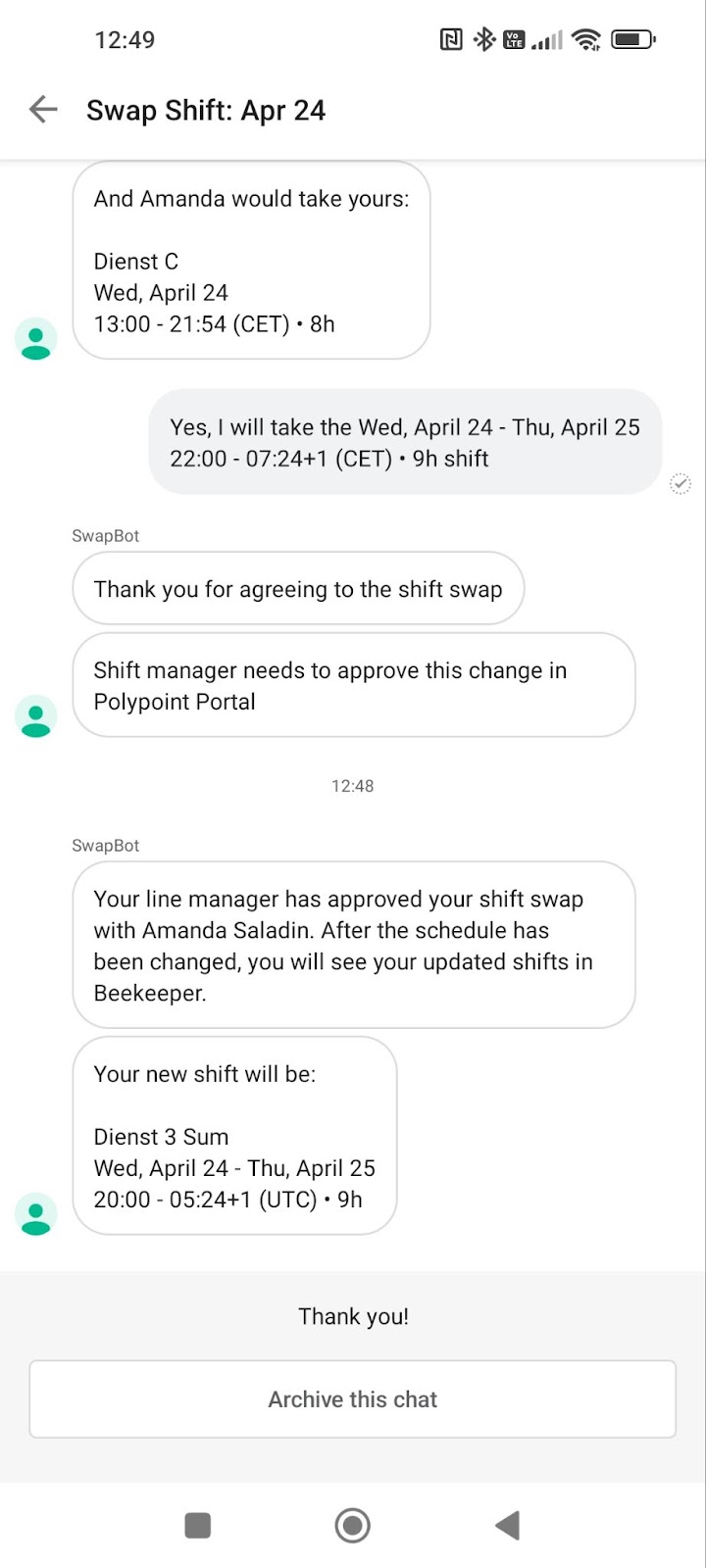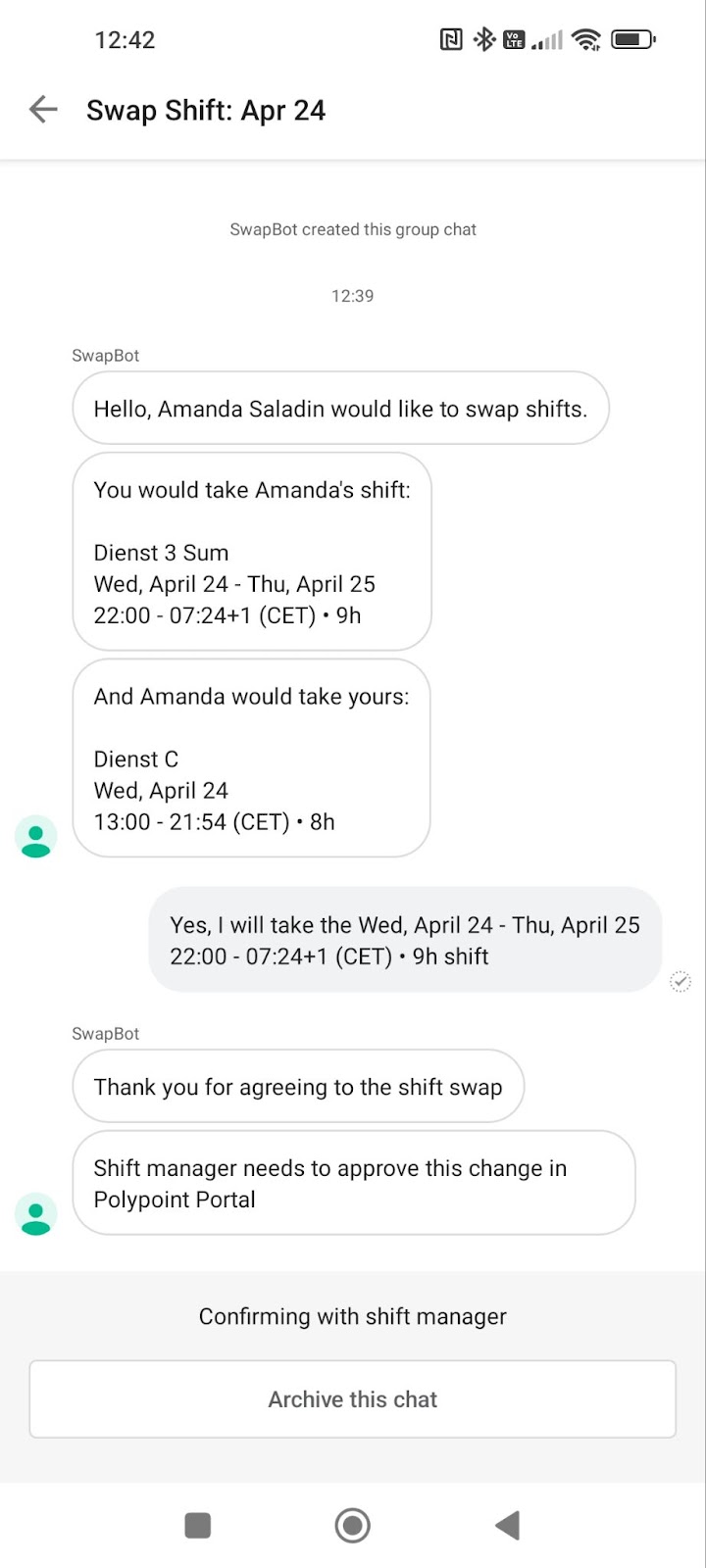Ein*e Schichtleiter*in genehmigt den Tausch zwischen Amanda und Frieda in POLYPOINT gemäß den POLYPOINT-Instruktionen. Sobald ein Schichttausch von einem*r Schichtleiter*in genehmigt wurde, wird eine Bestätigungsnachricht an beide Parteien gesendet und der Tausch wird im Dienstplan abgebildet.