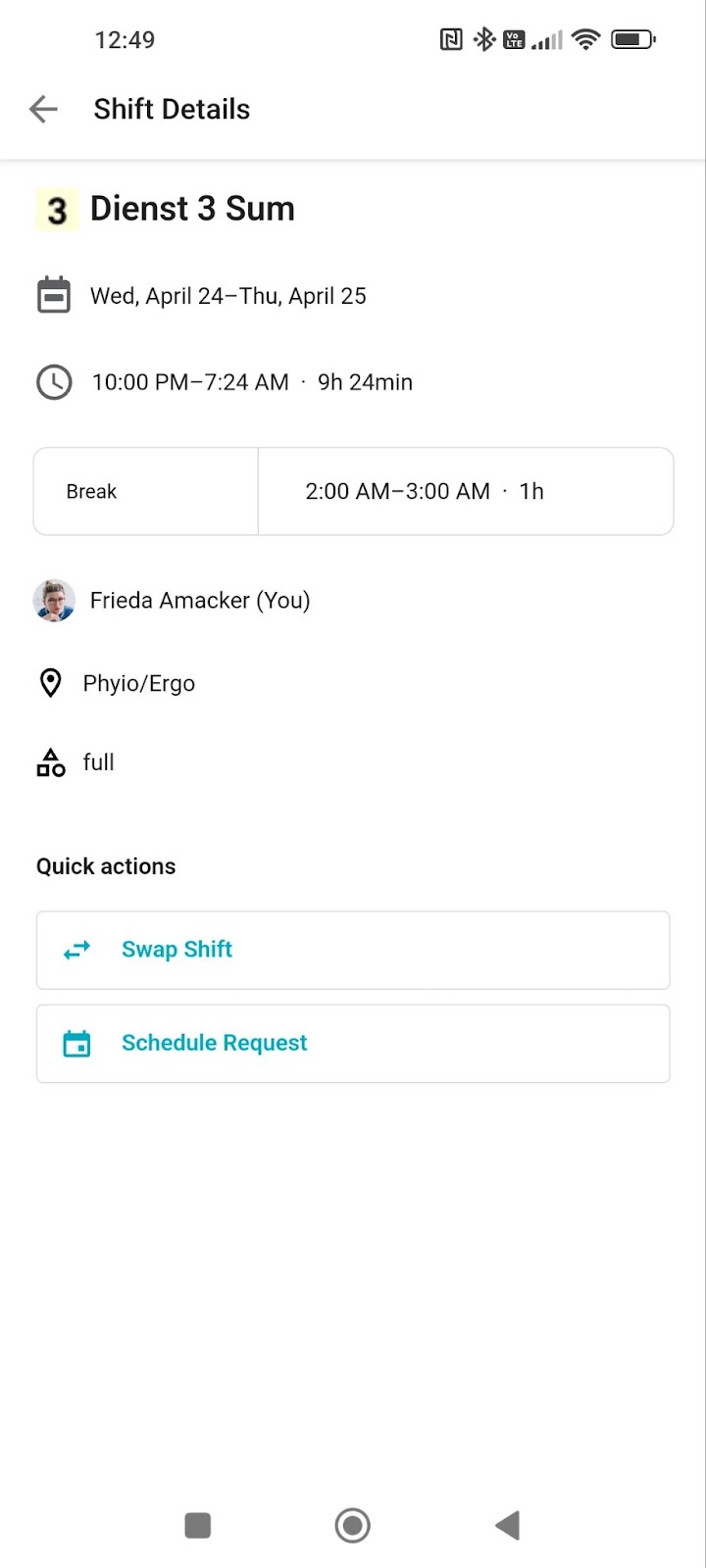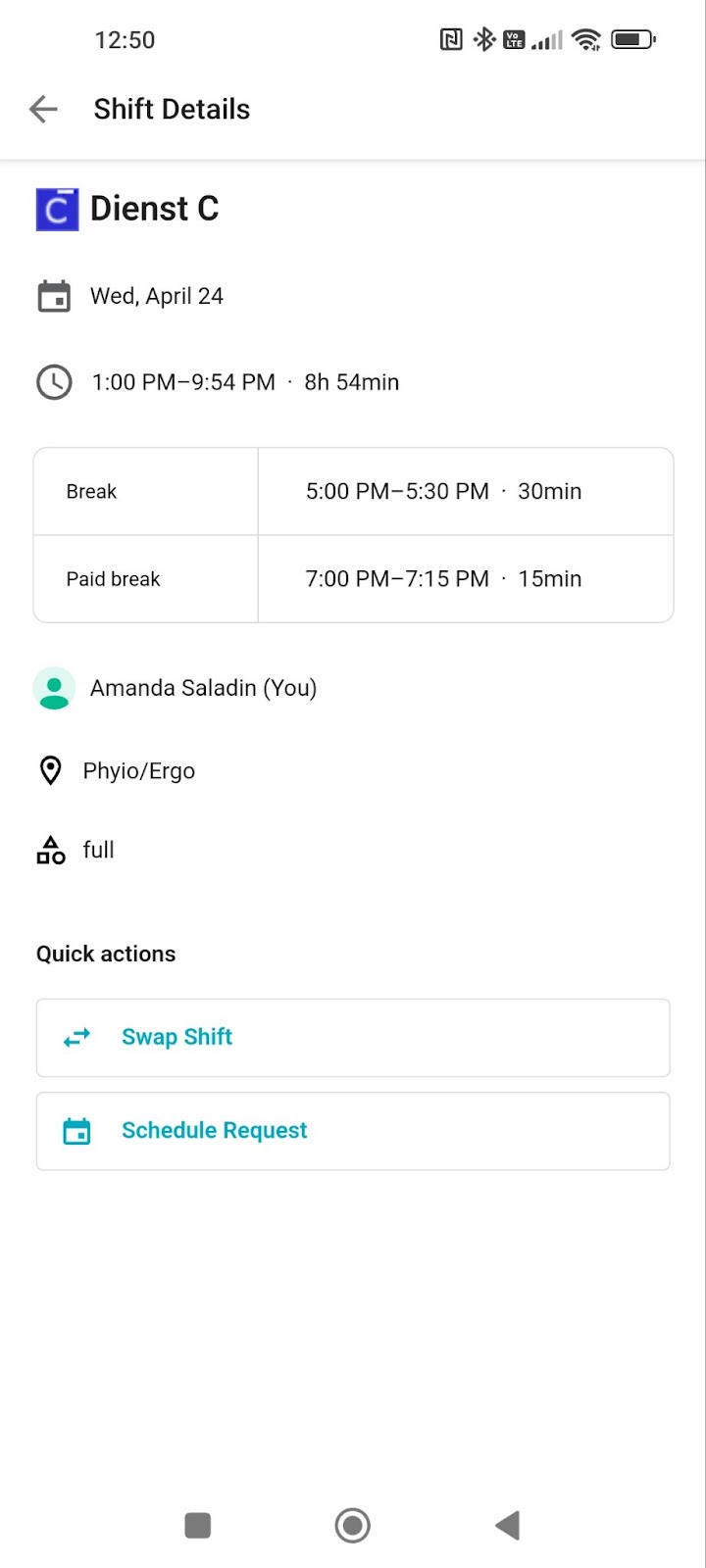 - Amanda Saladin, die ihre Schicht vom 24. April 2024 tauschen möchte.