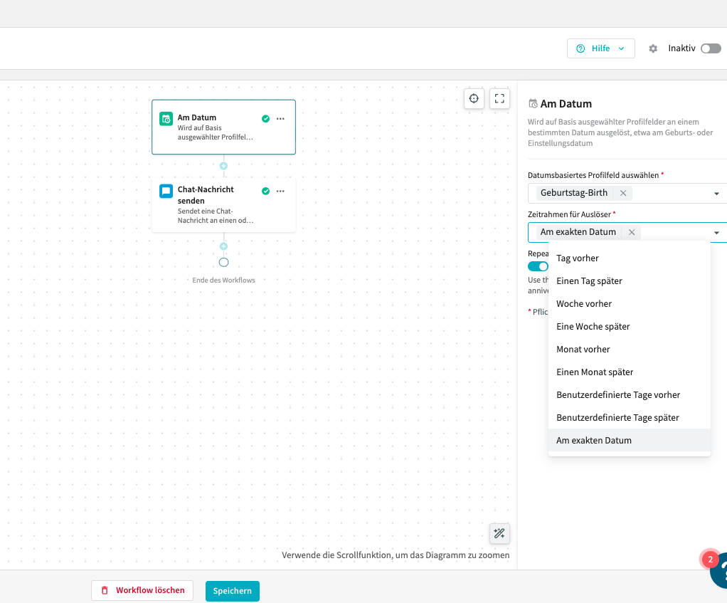 - Am exakten Datum – Wird am exakten Datum ausgelöst. Beispiel: Eine Geburtstagsnachricht am Geburtstag des Nutzers.