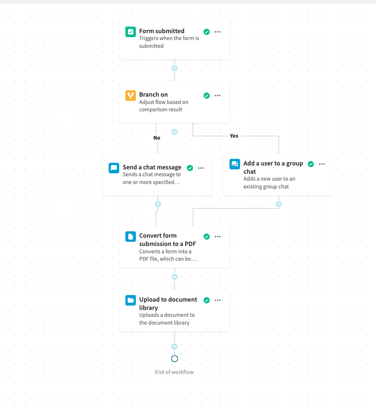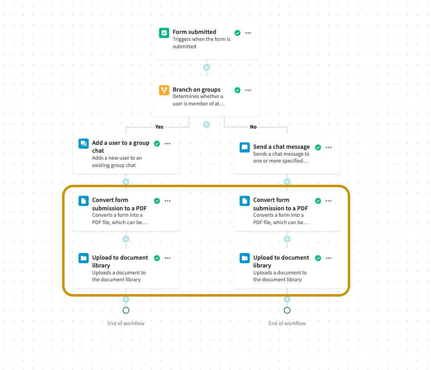 Make your workflows shorter and easier to maintain by combining two or more branches into a single path. This is handy when you want to do different things based on a condition (Yes/No, A/B, etc.) and then continue with the same follow-up steps.
