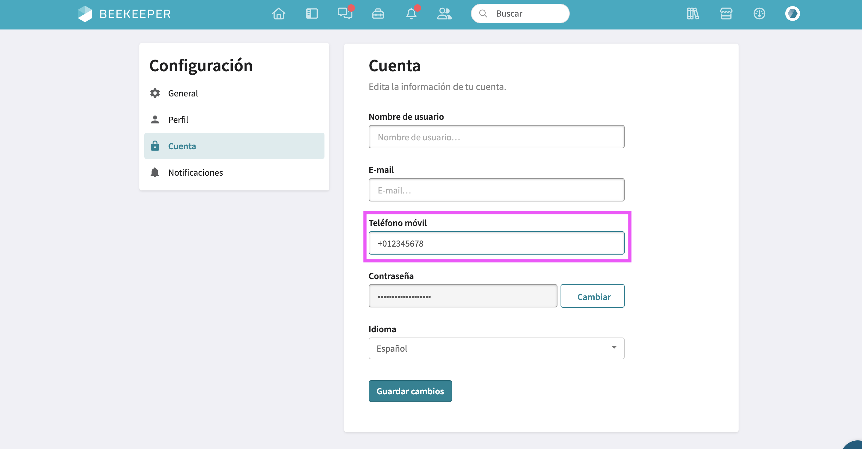 Cuando esta marca está activada, permite a los usuarios editar su número de teléfono en 'Perfil y Configuración' > 'Cuenta'.