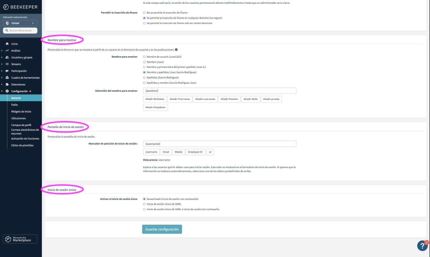 La sección de Seguridad permite configurar el cierre automático de sesión periódico para todos los usuarios estipulado por días. Otra funcionalidad que se encuentra aquí es la integración de iframe, que se puede autorizar y desautorizar.