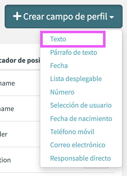 - Haz clic en 'Crear Campo de Perfil' y luego selecciona la opción 'texto'.