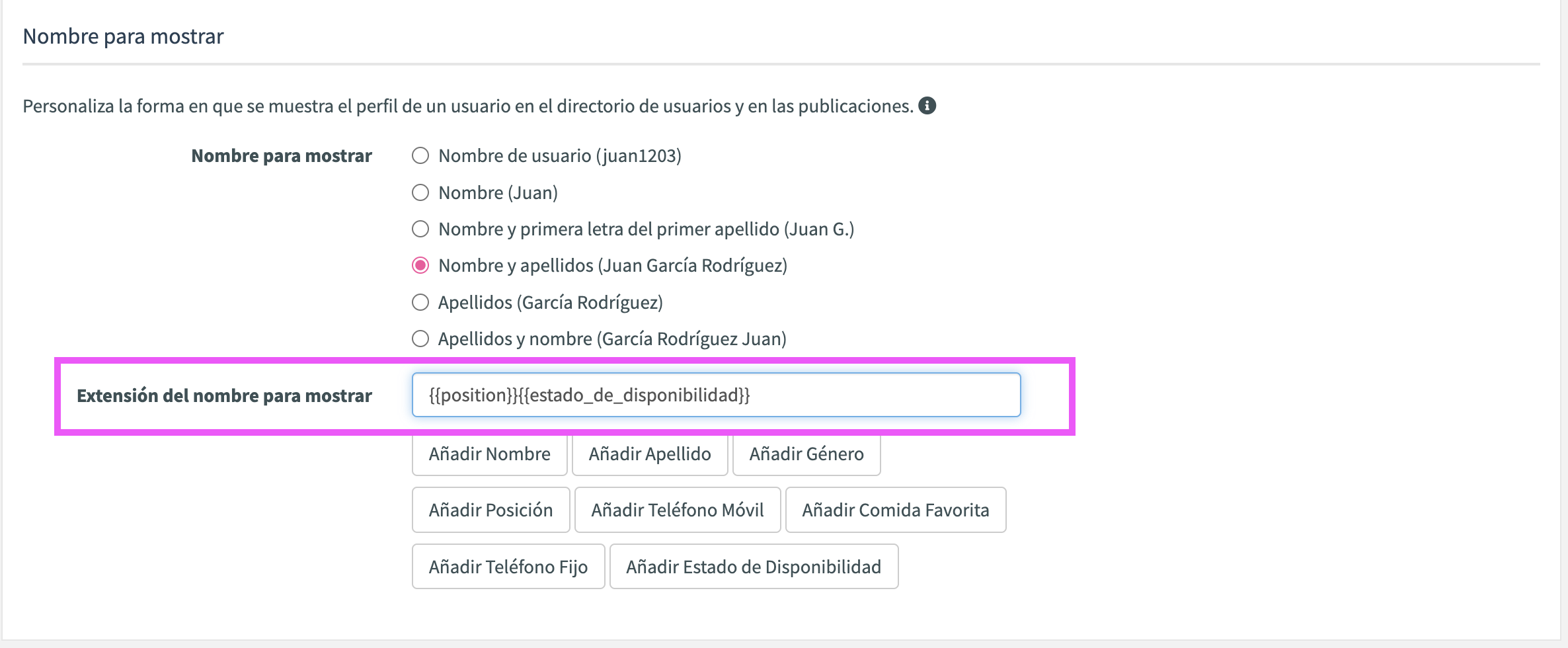 - En el campo Extensión del nombre para mostrar, añade {{estado_de_disponibilidad}} después de {{posicion}}.