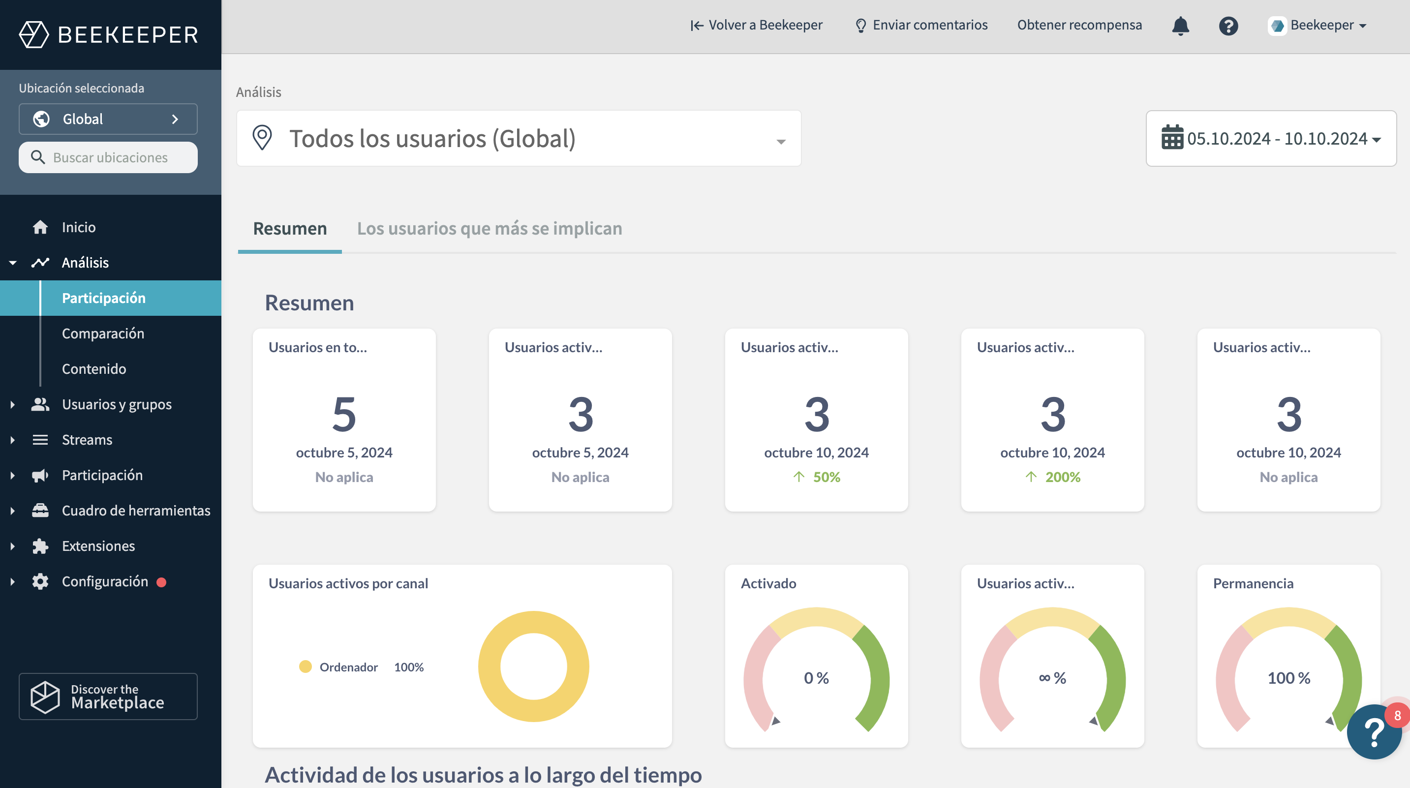 Para empezar, abre tu aplicación de Beekeeper en tu ordenador. Después de iniciar sesión, haz clic en el icono del velocímetro en la esquina superior derecha de la página para explorar el Panel de Control (Dashboard).