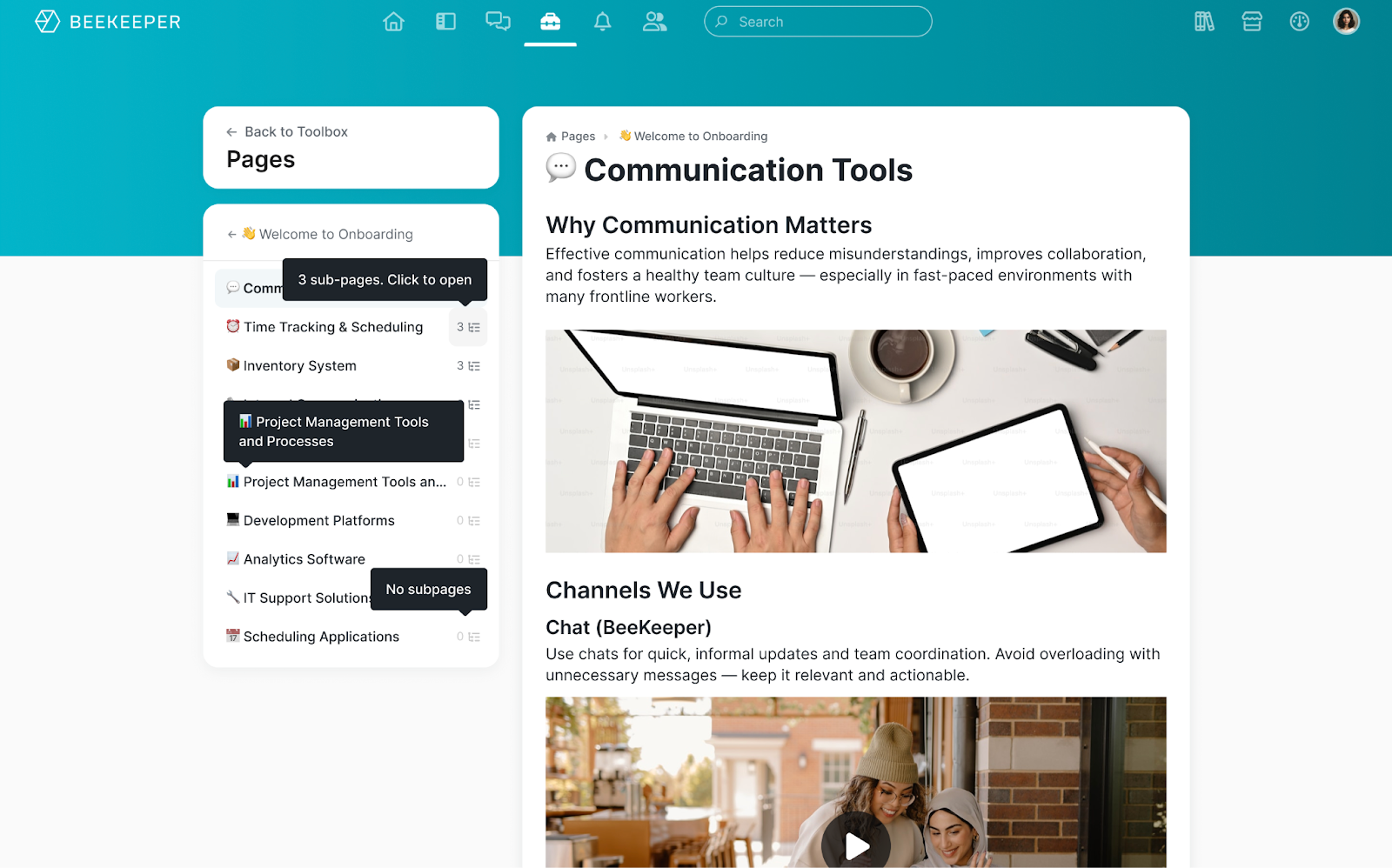 Las Páginas permiten crear y compartir contenidos estructurados y visualmente atractivos, como guías de incorporación, manuales de empresa, resúmenes de formación, etc., a los que se puede acceder desde un único lugar.