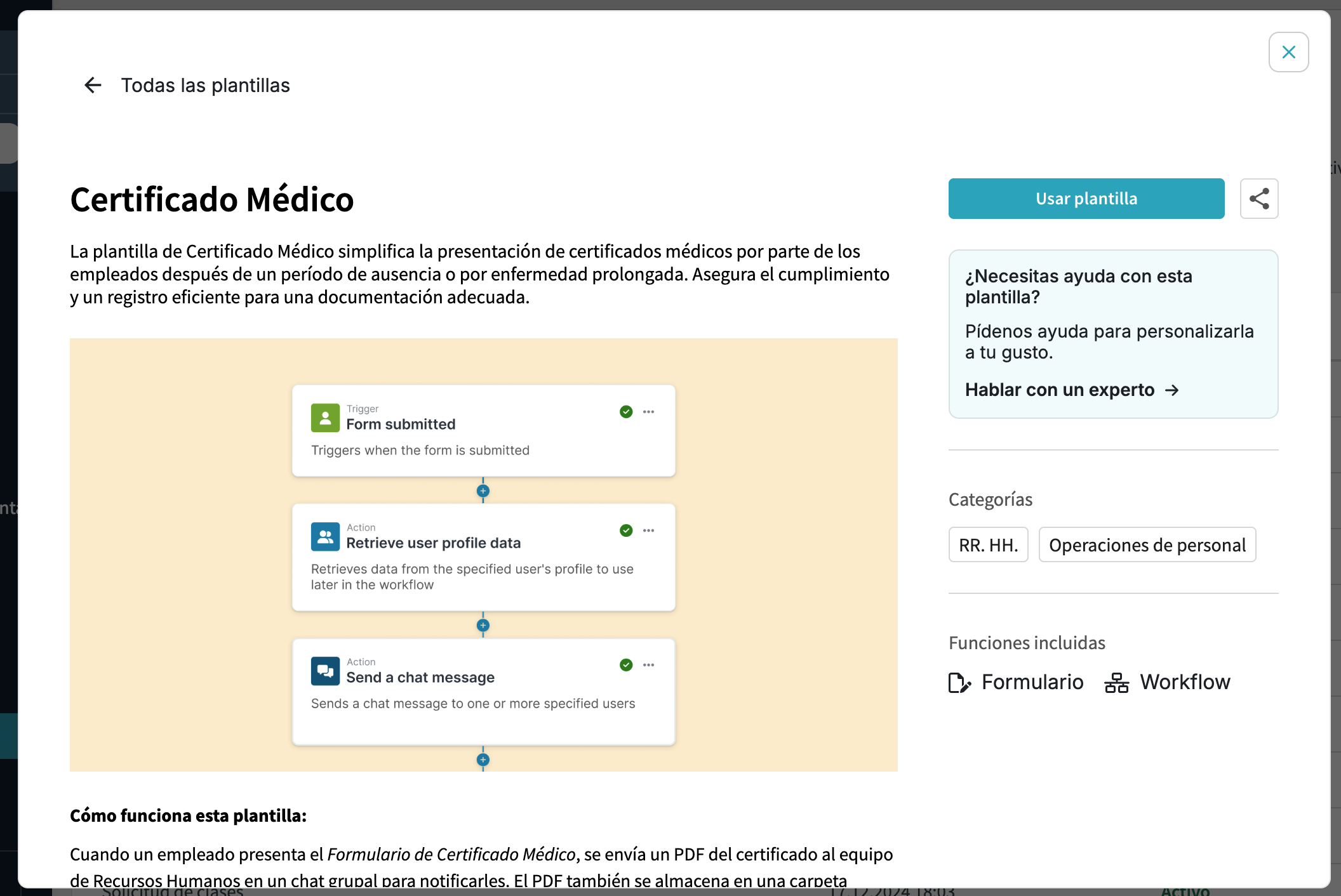 - Configuración: Diseña un formulario con un campo de carga de archivos para el certificado que incluya campos para el nombre del empleado y las fechas de ausencia. Configura el Workflow para enviar el certificado presentado al personal de RRHH pertinente y un chat-confirmación de que el documento se ha proporcionado al compañero adecuado.