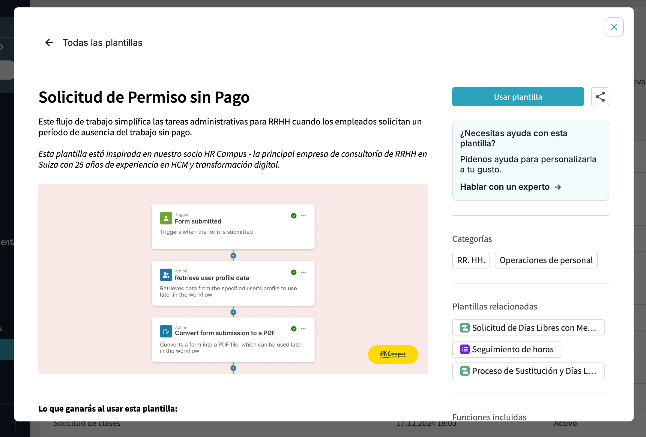 - Configuración: Crea un Workflow con un formulario que incluya campos para el tipo de ausencia, fechas de inicio y fin y comentarios opcionales. Dirige la solicitud al gestor adecuado para su aprobación. Utiliza las acciones del Workflow para proporcionar mensajes de chat y tareas relevantes para el departamento de RRHH.