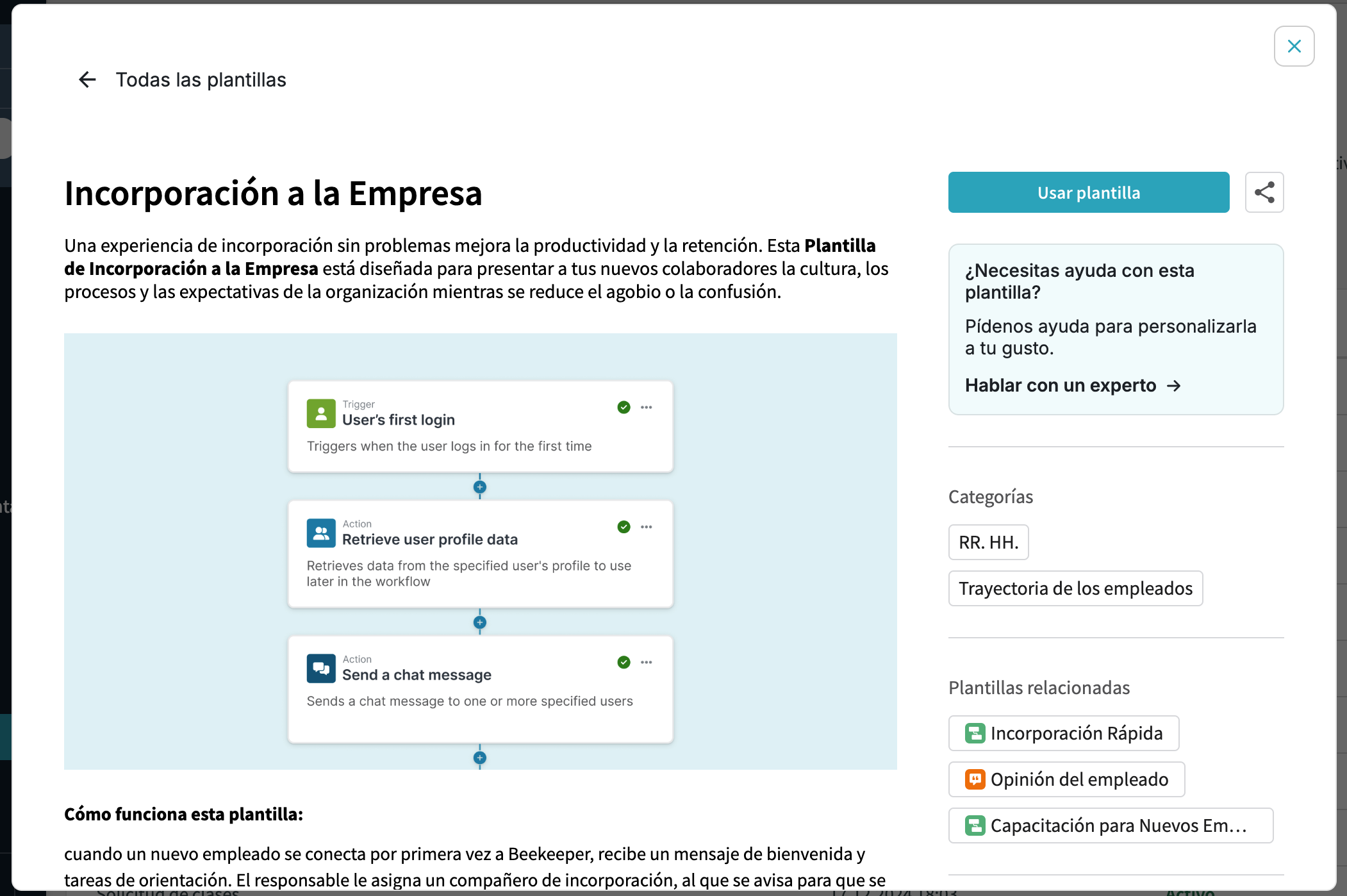 - Configuración: Crea un Workflow desencadenado para los nuevos usuarios que les presente información clave sobre las características de Beekeeper, tareas para navegar por la plataforma, como subir una foto de perfil o escribir su primer mensaje de chat, y dónde encontrar ayuda. Esto puede incluir enlaces a tutoriales, preguntas frecuentes e información de contacto para asistencia.