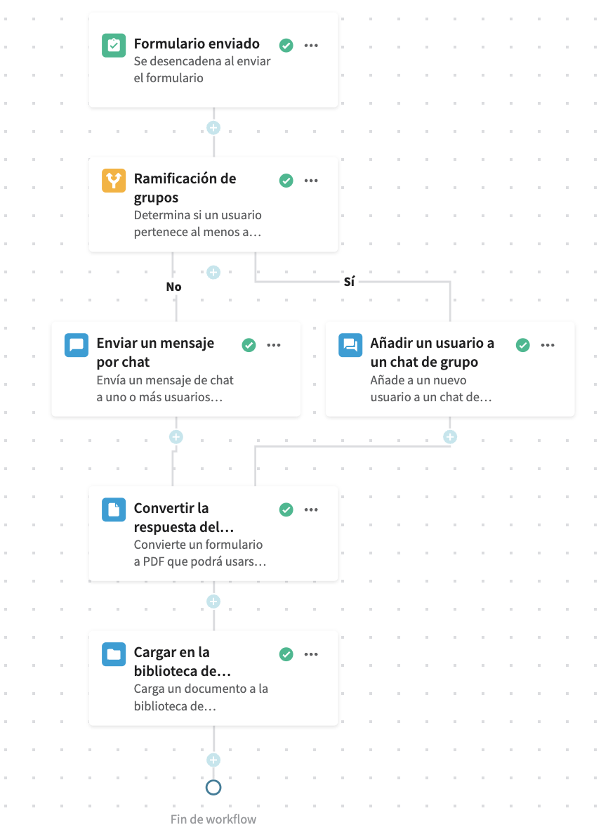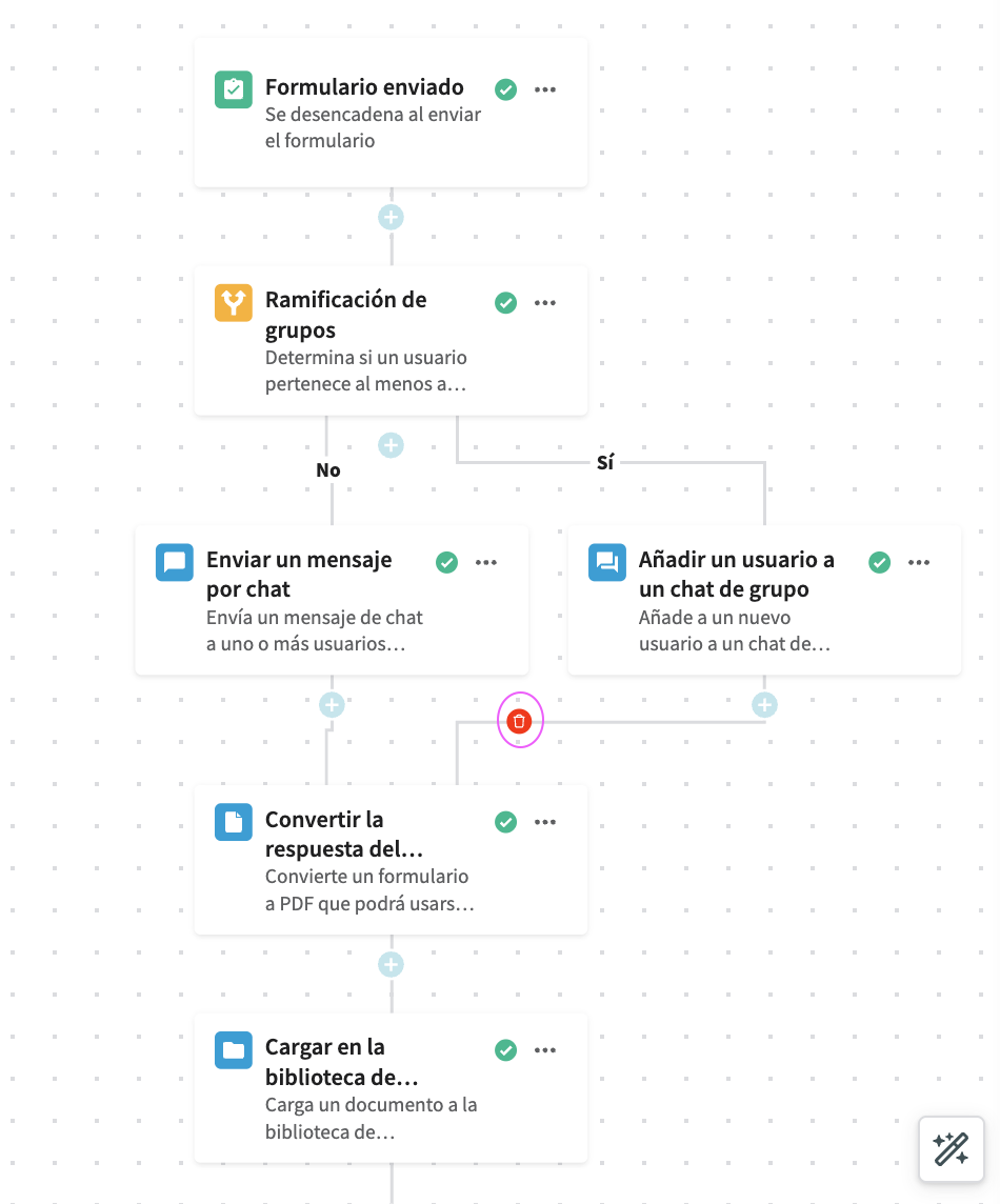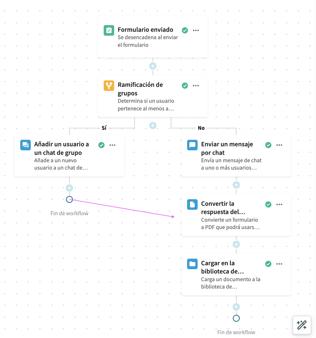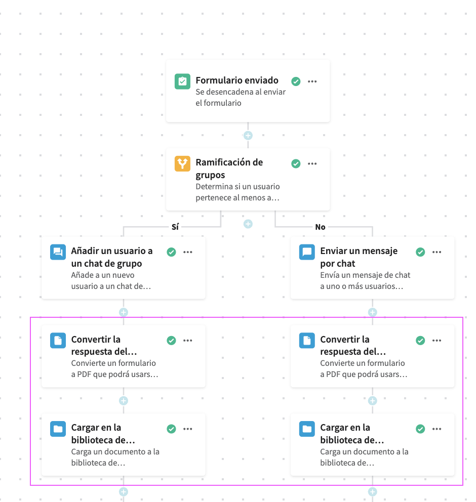 Acorta tus workflows y haz que sean más fáciles de mantener combinando dos o más ramificaciones en una sola ruta. Esto resulta útil cuando quieres hacer cosas diferentes en función de una condición (Sí/No, A/B, etc.) y luego continuar con los mismos pasos de seguimiento.
