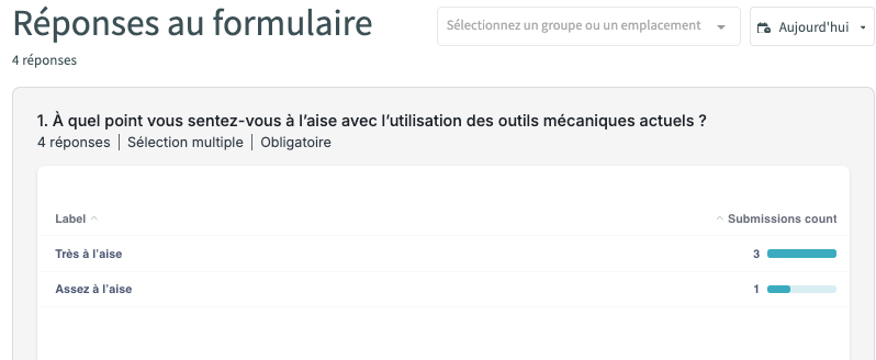 Pour affiner les analyses, la vue Analyse du contenu du formulaire propose des options de filtrage flexibles. Les filtres vous aident à vous concentrer sur les réponses les plus pertinentes par lieu, groupe ou période.