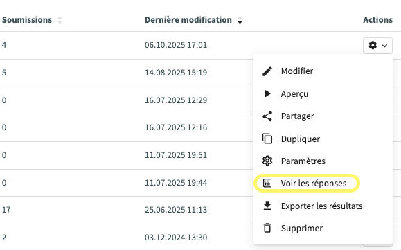 - Depuis le menu d’action de la liste des formulaires en cliquant sur « Voir les réponses ».