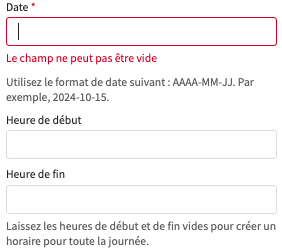 Il s'agit d'une approche différente de celle de notre API, qui exige à la fois la date de début et la date de fin. L'approche avec la date divisée, l'heure de début et l'heure de fin facilite la gestion des scénarios réels dans lesquels :