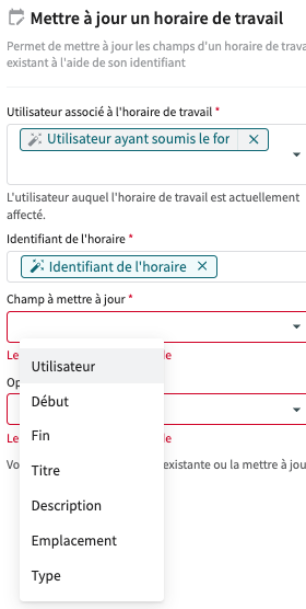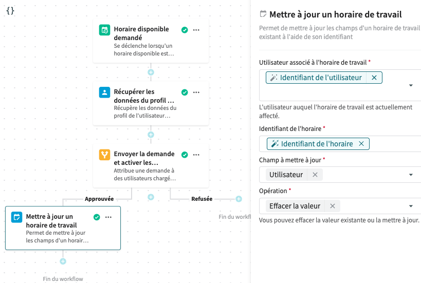 Ce nœud permet de mettre à jour ou d'effacer la valeur d'un seul attribut de l'horaire. Si vous souhaitez mettre à jour plusieurs attributs de l'horaire, vous devrez ajouter plusieurs nœuds « Mettre à jour un horaire de travail ».