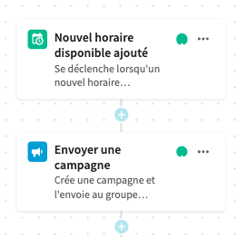 Nouvel horaire disponible ajouté Déclencheur | Permet de déclencher un workflow chaque fois qu'un nouveau poste vacant est ajouté à un planning ou qu'un poste devient vacant (affectation supprimée). | Lorsqu'un poste vacant est ajouté à un planning, envoyez une campagne aux employés pour les informer de cette nouvelle opportunité de travail. |