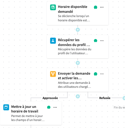 Exemple de workflow avec un déclencheur « Horaire disponible demandé » et une action « Mettre à jour un horaire de travail ».