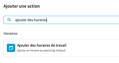 Les nœuds d'action « Ajouter un horaire de travail » et « Mettre à jour un horaire de travail » permettent de spécifier la date, l'heure de début ou l'heure de fin d'un horaire, seule la date étant obligatoire.