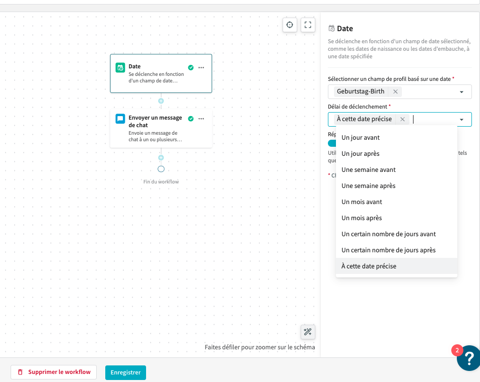 - À cette date précise – déclenche à la date exacte. Exemple : un message d’anniversaire le jour même de l’anniversaire de l’utilisateur.